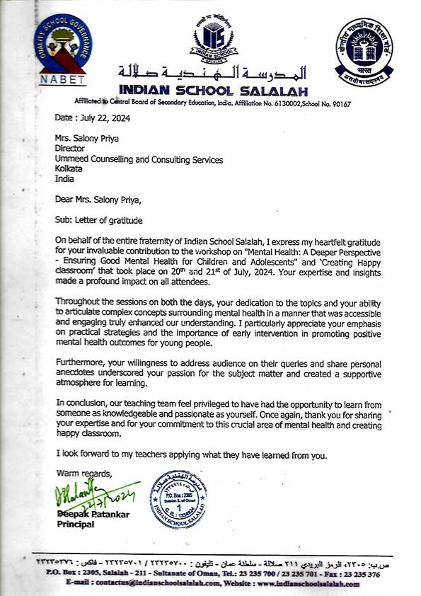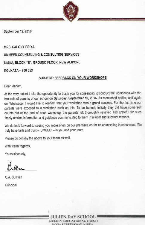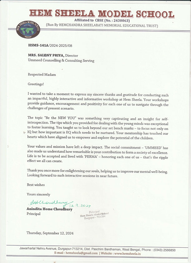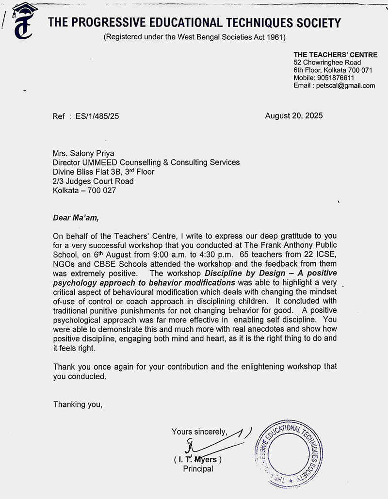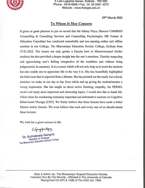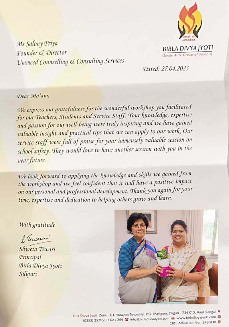 This is to state that Ms. Salony Priya of Ummeed Counselling Services has conducted a workshop on "T ...