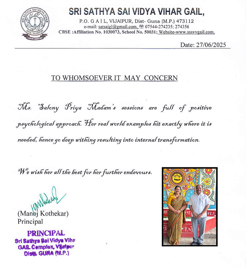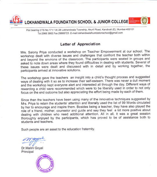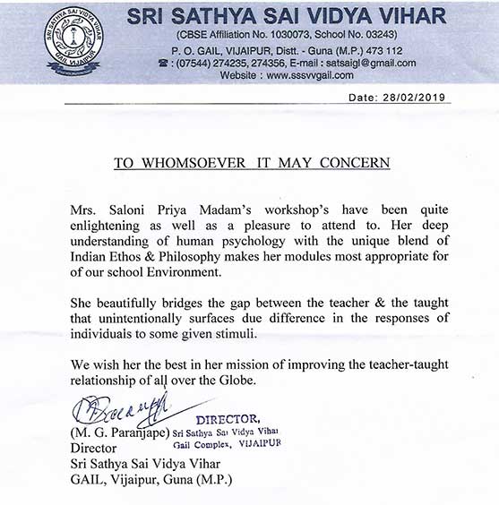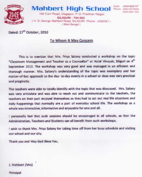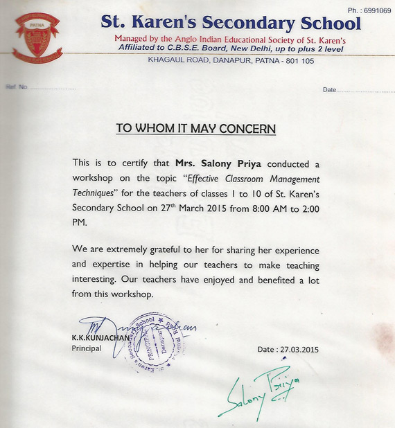 Dear Madam, This is to certify that Mrs. Salony Priya conducted a workshop on the topic "Effective ...