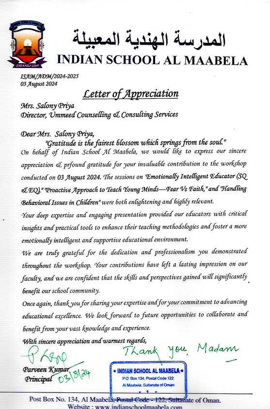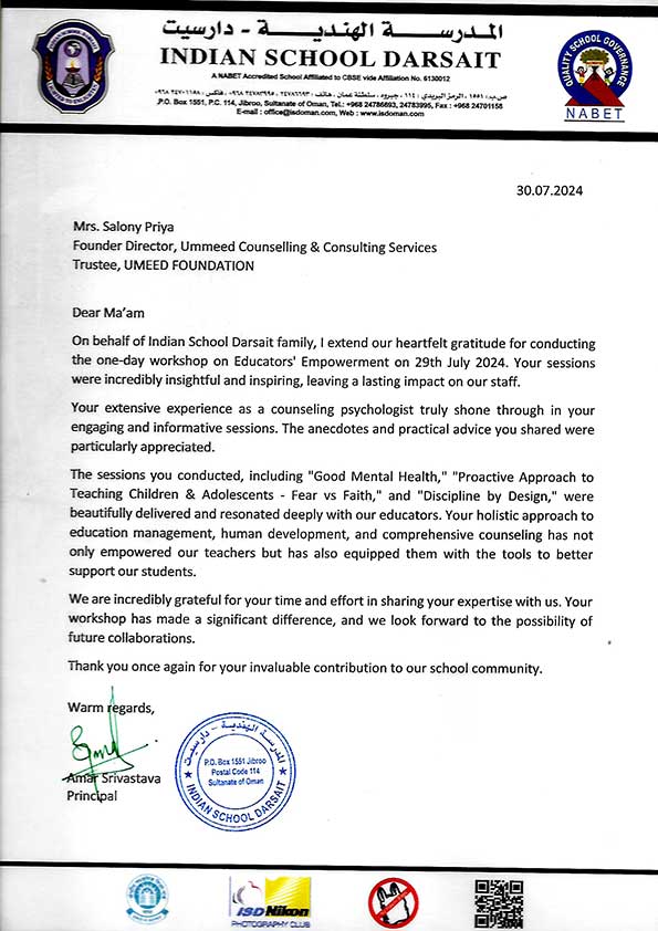 On behalf of Indian School Darsait family, I extend our heartfelt gratitude for conducting the one-d ...