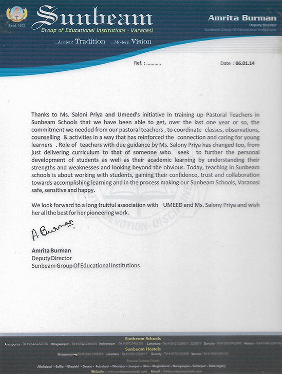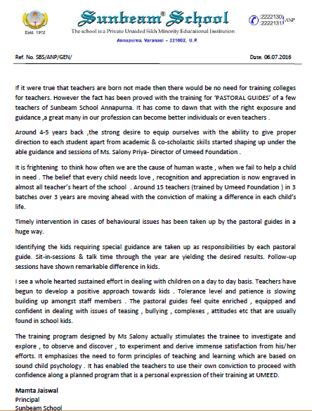 Thanks to Ms. Salony Priya and Ummeed in training Pastoral Teachers in Sunbeam Schools that we have ...