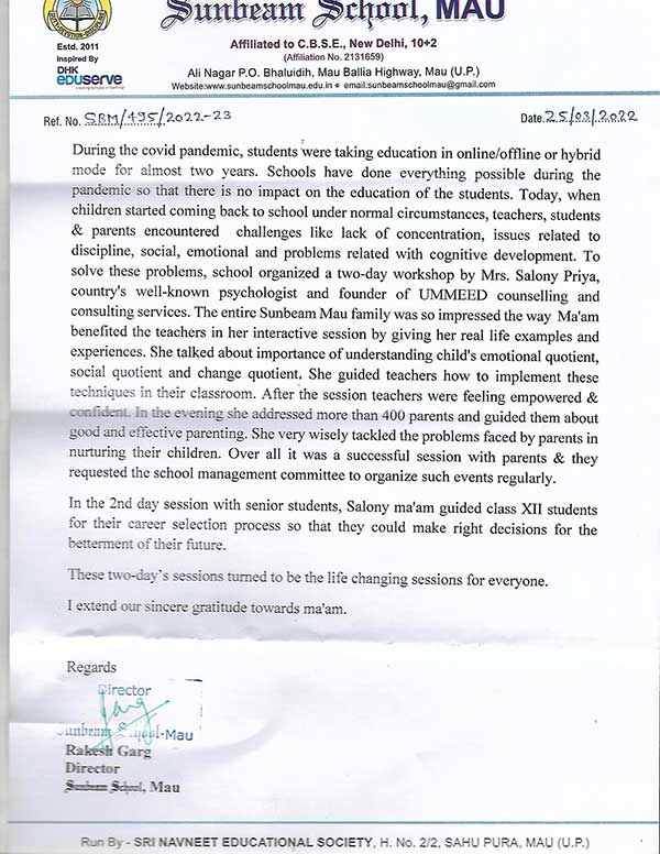 "Sunbeam School, MAU expresses their gratitude to Ms. Salony Priya for being empowered by the int ...