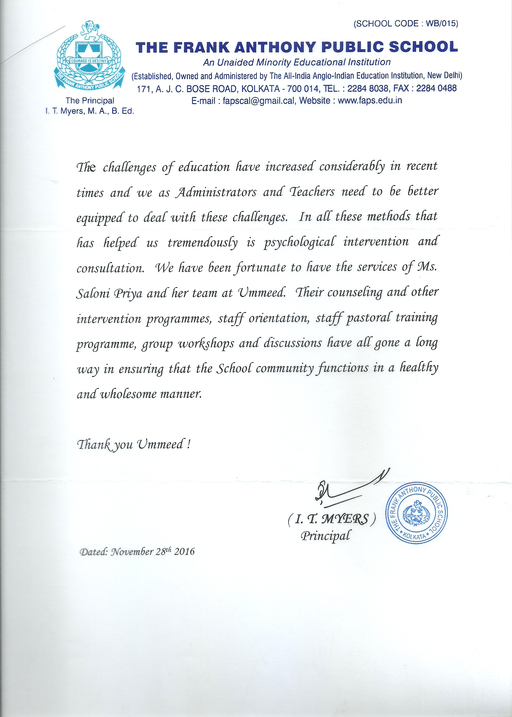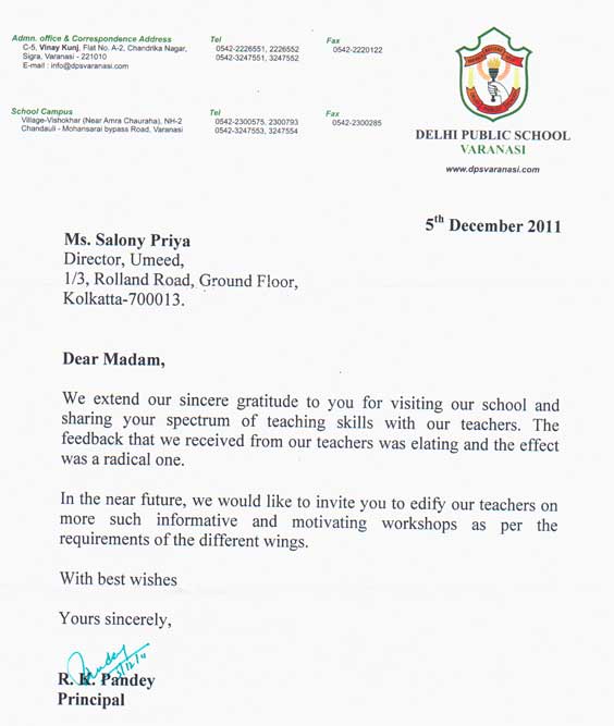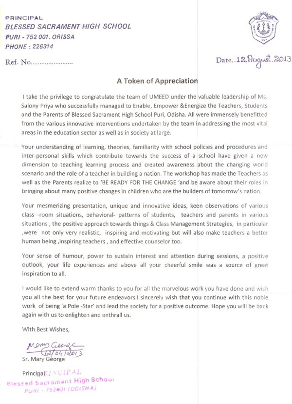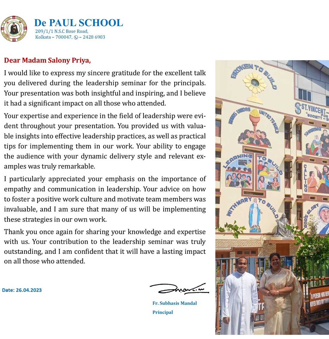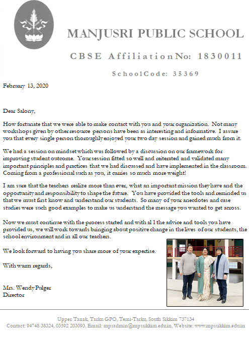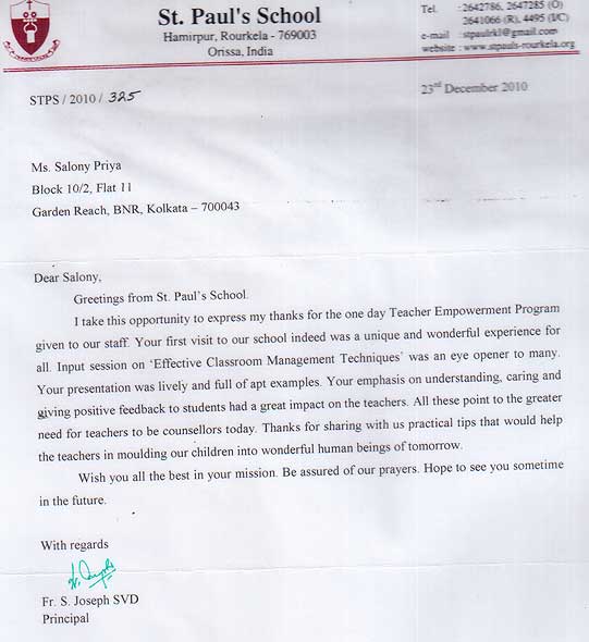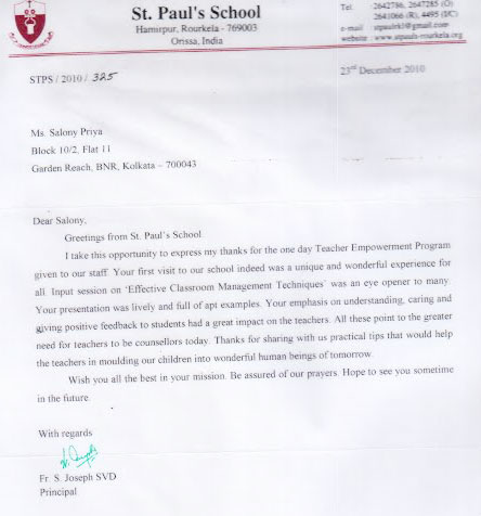 Dear Salony, Greeting from St. Pauls School. I take this opportunity to express my thanks for the o ...