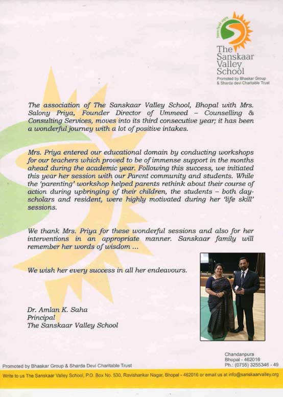 The association of The Sanskaar Valley School, Bhopal with Mrs. Salony Priya, Founder Director of Um ...