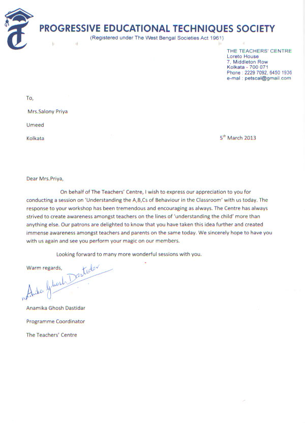 On behalf of The Teachers Centre, I wish to express our appreciation to you for conducting a session ...