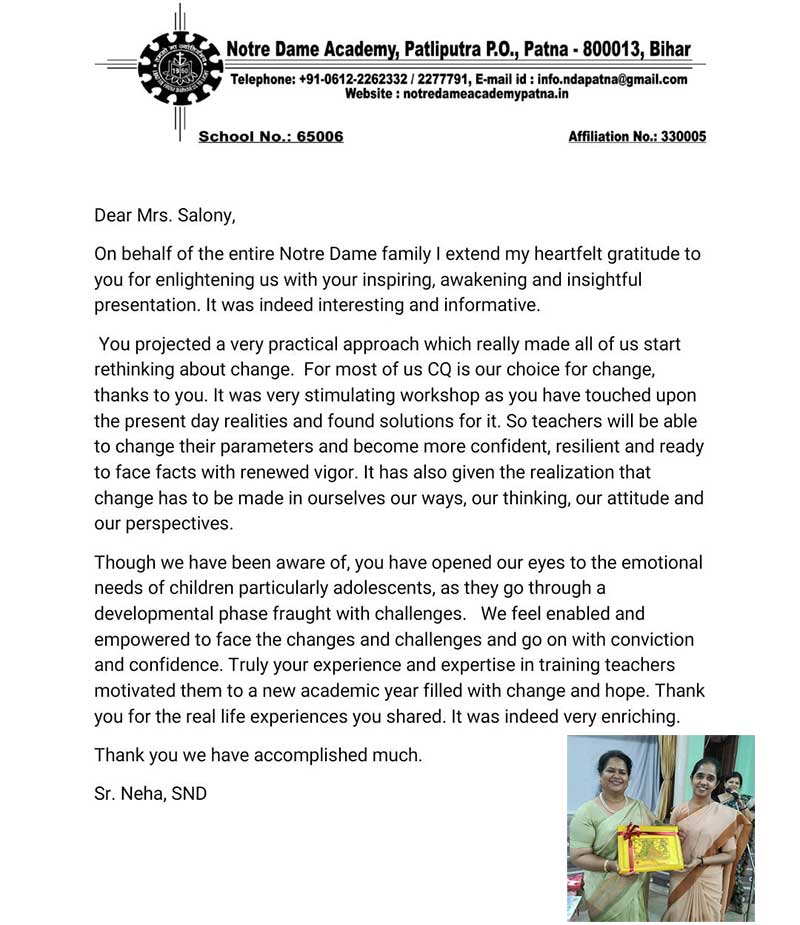 "Notre Dame family extended heartfelt gratitude to Ms. Salony Priya for enlightening the educators w ...