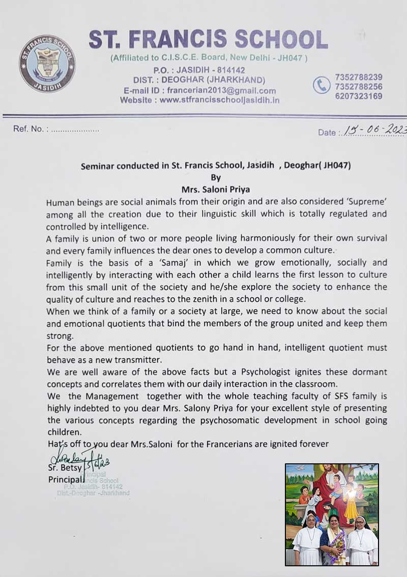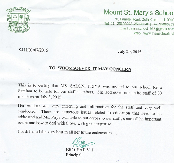This is to certify that MS. SALONY PRIYA was invited to our school for a Seminar to be held for our ...