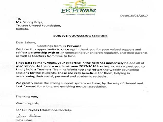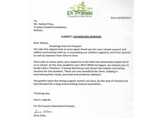 "Kudos to Umeed Foundation, on your commitment to reach out to serve the distressed & the depressed. May you continue to touch many more people, young & old, making a difference to their lives.’ - Mrs Meenaksi Atal, Ex Vice Principal The Heritage School, Kolkata