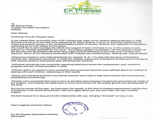 " From Umeed Foundation today they have come to Mahajibon Paikpara centre. We all have celebrated advance Christmas , we are grateful to Umeed Foundation very much. Thank you for giving study materials and for cutting cake,to share happiness with the children..... Many best wishes to the Umeed Foundation for being with us." -- Moitrayee Banerjee ( Mahajibon NGO -- President )