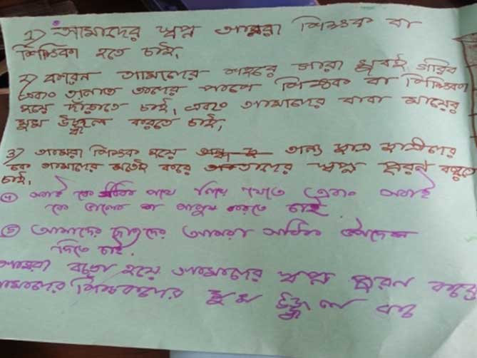 "We learn about bullying system, we should do not tease anyone. We should helps the bullying peoples and children. We should do not disturb anyone. We should talk with bullying children and solved the issues. I wish, I want learn again more about bullying system. Thank you ma'am to listen us about bullying system." - Saddam, Class V.